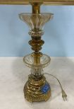 Mid Century Style Brass and Glass Candle Stick Lamp, worn shade, 30"h. Mid Century Style Brass and Glass Candle Stick Lamp, worn shade, 30"h.