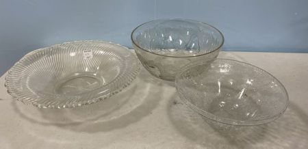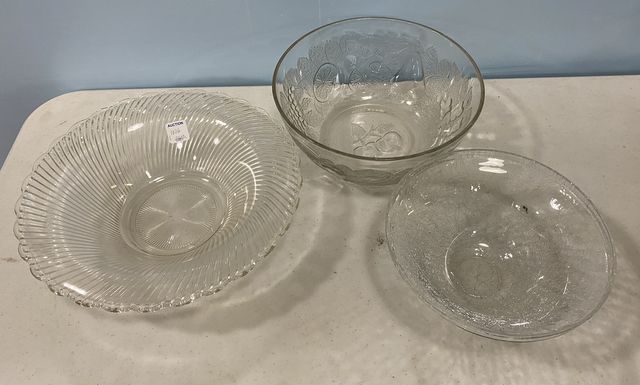 Three Clear Glass Serving Bowls, salad, fruit, assorted designs, largest is 12"dia. Location: Top Shelf Front Wall Shelves Three Clear Glass Serving Bowls, salad, fruit, assorted designs, largest is 12"dia. Location: Top Shelf Front Wall Shelves