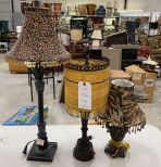 Three Decor Table Lamps, urn and candle stick style, black color, with shades. Three Decor Table Lamps, urn and candle stick style, black color, with shades.