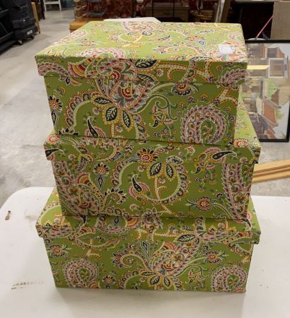 Raymond Waites Decorative Storage Boxes, three assorted sized. Location: Back White Cases Raymond Waites Decorative Storage Boxes, three assorted sized. Location: Back White Cases