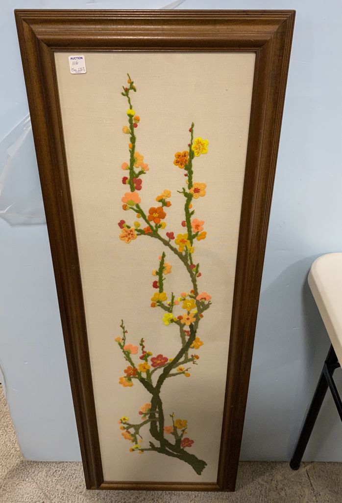 Framed Needle Point Tree Limb, framed, 47"h., 17"w. Location Left Side 3rd Row Framed Needle Point Tree Limb, framed, 47"h., 17"w. Location Left Side 3rd Row