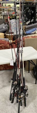 Grouping of Fishing Rods and Reels, push buttons and open faces, Location Back Wall Grouping of Fishing Rods and Reels, push buttons and open faces, Location Back Wall