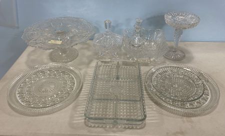 Group of Pressed Vintage Glassware, cake stand, footed bowl, divided relish dish, plates, candy dish, candle stand. Group of Pressed Vintage Glassware, cake stand, footed bowl, divided relish dish, plates, candy dish, candle stand.
