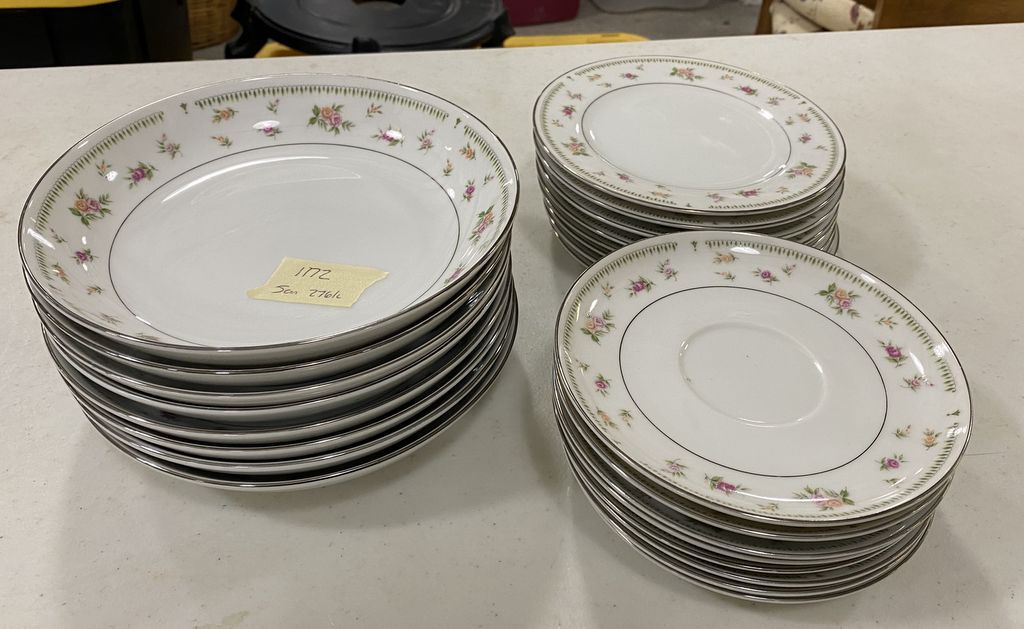 Abingdon China Set, 8 bowls, 8 saucers, 8 dessert plates, Location: Back White Cases Abingdon China Set, 8 bowls, 8 saucers, 8 dessert plates, Location: Back White Cases