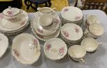 Homer Laughlin "Virginia Rose" China Set, platters, 8 plates, saucers, cups, bowls, creamer, sugar. Location Back Silver Metal shelves Homer Laughlin "Virginia Rose" China Set, platters, 8 plates, saucers, cups, bowls, creamer, sugar. Location Back Silver Metal shelves