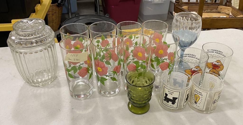 Group of Glassware, 8 flower glasses, canister, goblet, cups. Group of Glassware, 8 flower glasses, canister, goblet, cups.