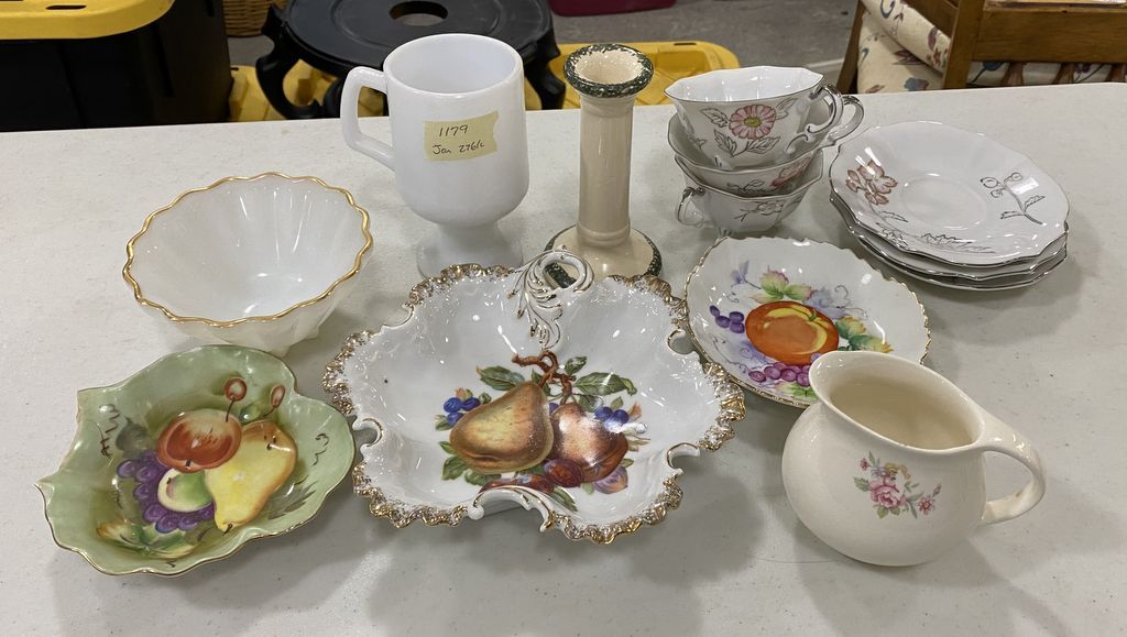 Milk Glass Mug, candle stick, three cups and saucers, porcelain bowl, creamer. Milk Glass Mug, candle stick, three cups and saucers, porcelain bowl, creamer.