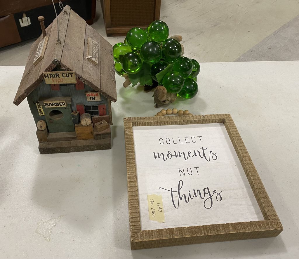 Hand Crafted Barber Bird House, Collect Moments Sign, and Fruit Decor, Location Back Front Side Metal Shelves 3rd Shelf Hand Crafted Barber Bird House, Collect Moments Sign, and Fruit Decor, Location Back Front Side Metal Shelves 3rd Shelf