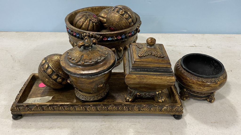 Decorative Resin Gold Color Decorations, center piece bowl, tray, small bowls, Location Back Metal shelves Back Side 3rd shelves Decorative Resin Gold Color Decorations, center piece bowl, tray, small bowls, Location Back Metal shelves Back Side 3rd shelves