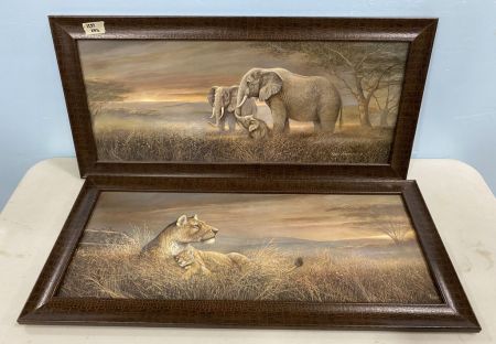 Elephants framed and Lions framed, 33"w., 15"h. Location Back Wall Elephants framed and Lions framed, 33"w., 15"h. Location Back Wall