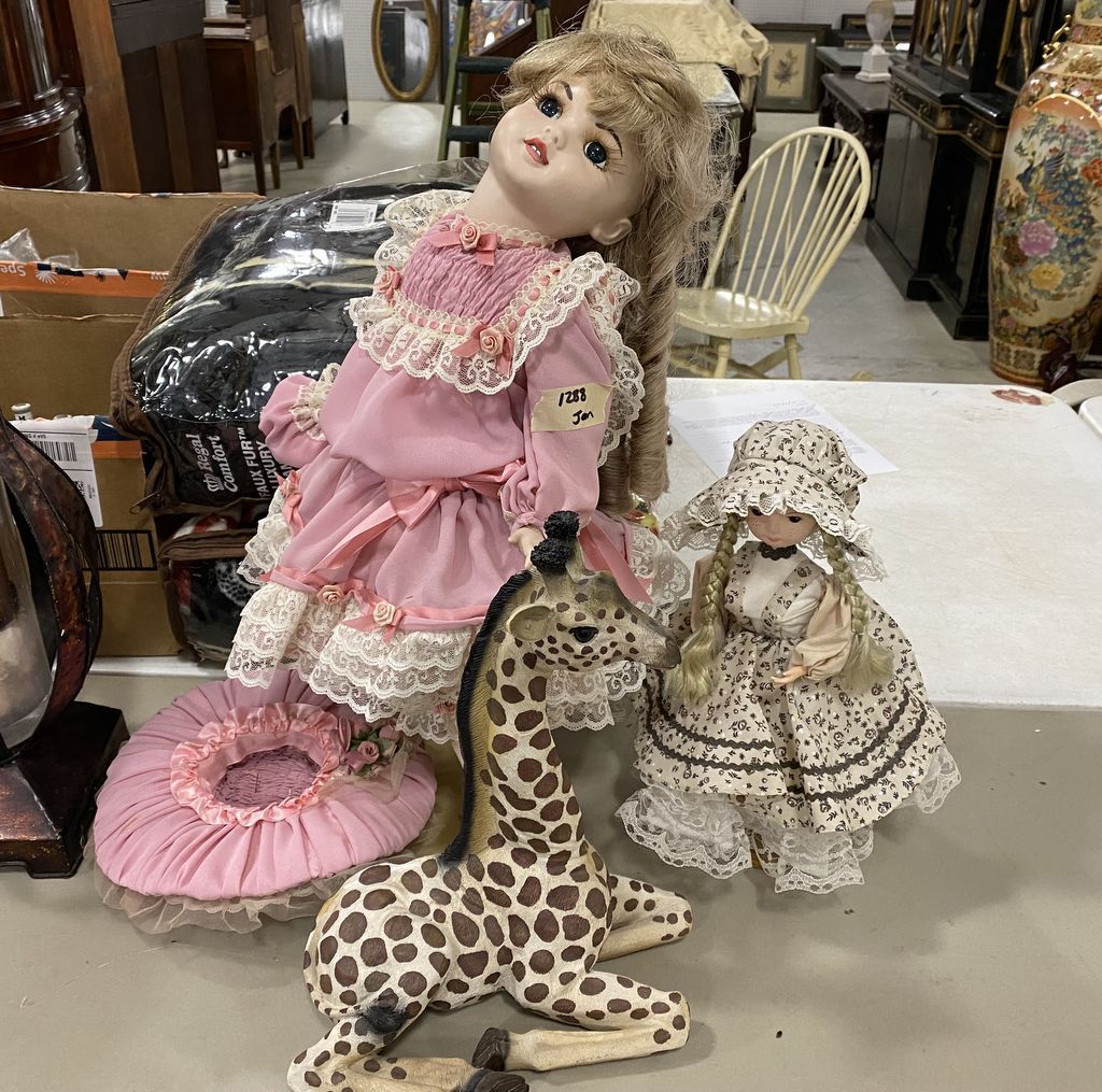 Large Collectible Dolls and Giraffe, Location: Back White Cases Large Collectible Dolls and Giraffe, Location: Back White Cases