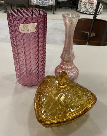 1300 Pink Glass Vase, Decorative Glass Vase, and Amber Candy Dish