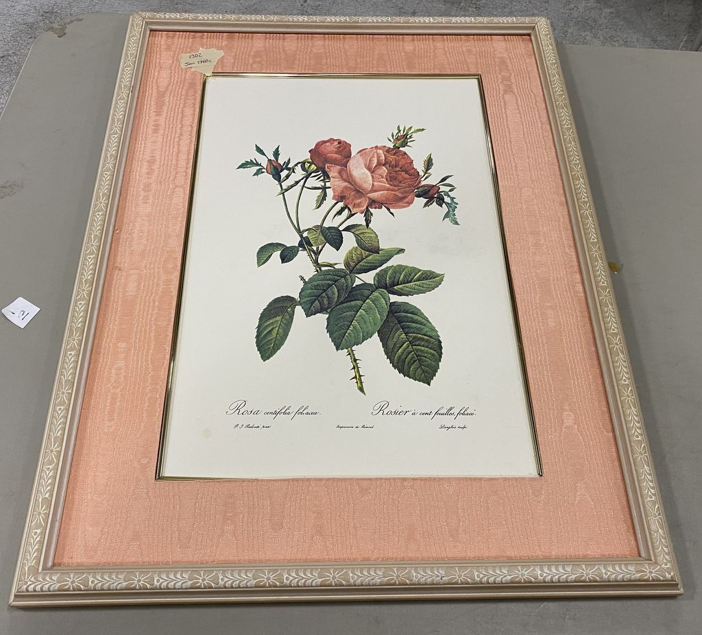 Framed Rose Print, frame is 25"h., 20"w. Location Back Silver Metal shelves Framed Rose Print, frame is 25"h., 20"w. Location Back Silver Metal shelves