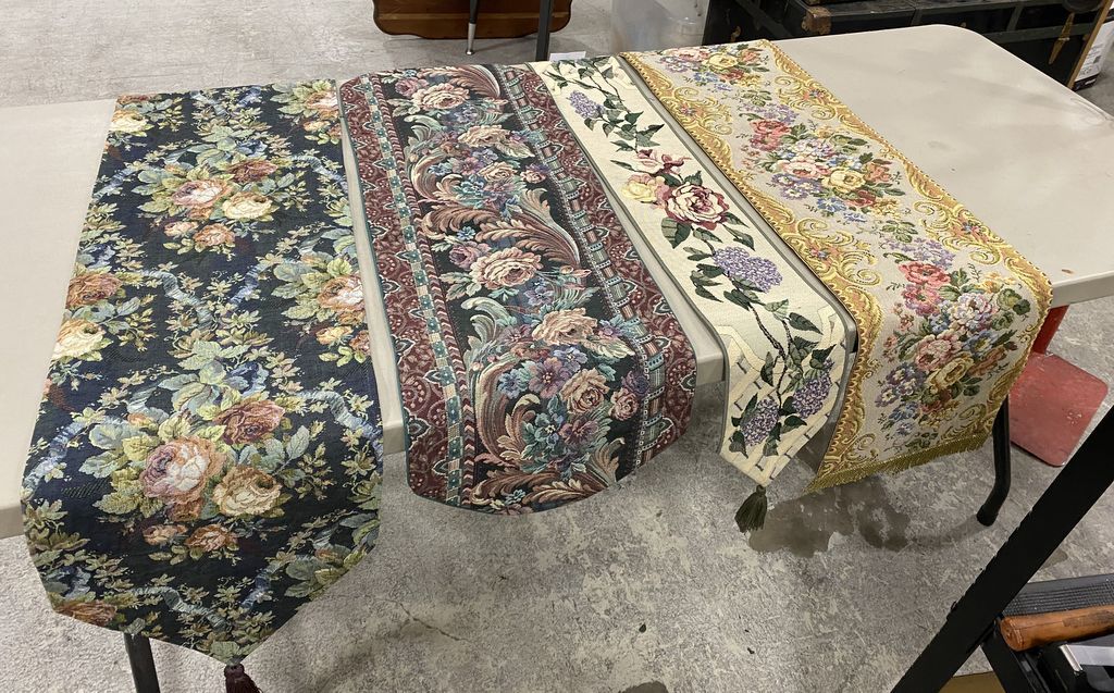 Three Table Runners and Bell Pull, Location Back Front Side Metal Shelves 3rd Shelf Three Table Runners and Bell Pull, Location Back Front Side Metal Shelves 3rd Shelf