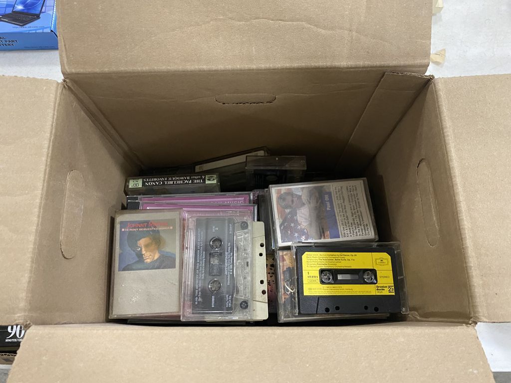 2 Boxes of Cassette Tapes, Location: Metal Shelves by Office, Location: Back Tall White Cases 2 Boxes of Cassette Tapes, Location: Metal Shelves by Office, Location: Back Tall White Cases