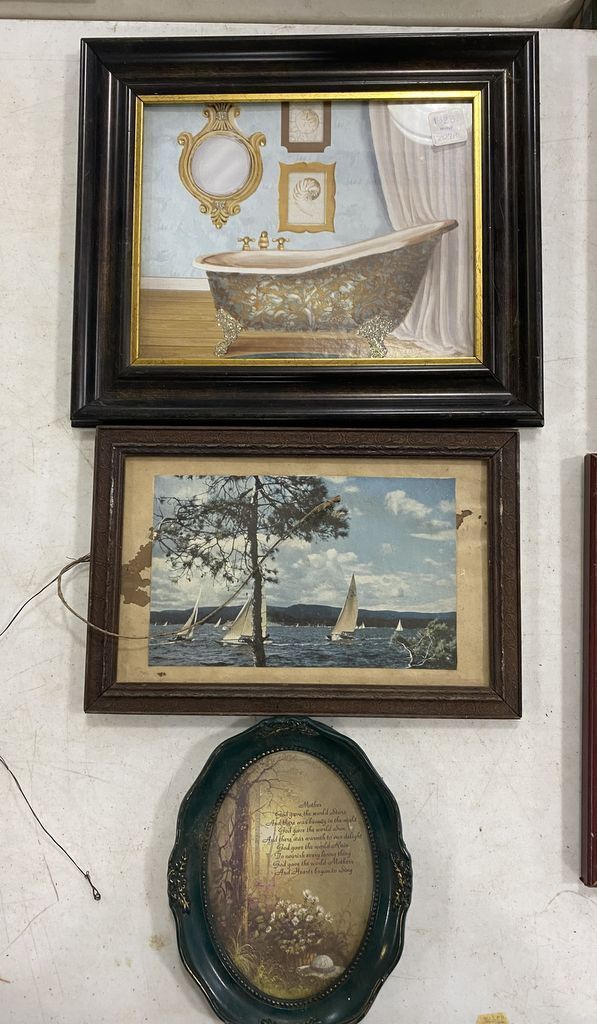 1328 Group of 3 Prints Framed Featuring Bathroom, Sailboats, and Poem About God