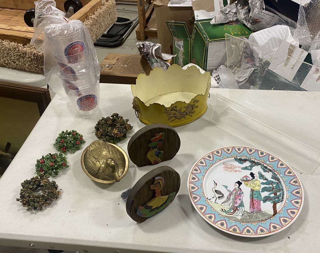 Box of Assorted Items Includes Japanese Decorative Plate, Bookends, Set of 4 Drinking Glasses, Covered Duck Metal Dish and Etc. In Box. Box of Assorted Items Includes Japanese Decorative Plate, Bookends, Set of 4 Drinking Glasses, Covered Duck Metal Dish and Etc. In Box.