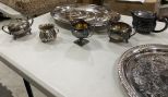 1464 Grouping of Silver Plated Creamers, Sugar with Lid, Engraved Tray, and Platter