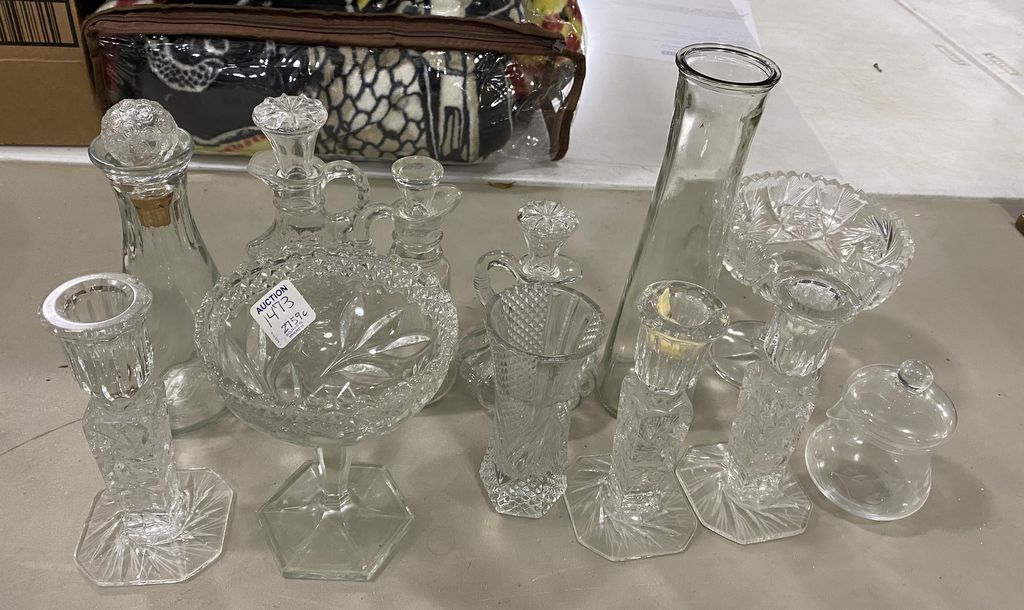 Grouping of Assorted Glassware Includes 4 Cruets with Stoppers, 2 Flower Bud Vases, 3 Matching Candle Stick Holders, 2 Cut Crystal Pedestal Candy Dishes, 1 Clear Glass with Glass Lid Creamer, Location Front Shelves Top Row Grouping of Assorted Glassware Includes 4 Cruets with Stoppers, 2 Flower Bud Vases, 3 Matching Candle Stick Holders, 2 Cut Crystal Pedestal Candy Dishes, 1 Clear Glass with Glass Lid Creamer, Location Front Shelves Top Row
