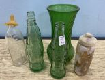 Grouping of Assorted Glass and Ceramic includes 3 Collector's Coca-Cola Glass Bottles, Vintage Glass Baby Bottle With Nipple, Ceramic Scroll Jar With Replica Scroll Inside, Green Glass Swirl Flower Vase, Location Front Shelves Top Row Grouping of Assorted Glass and Ceramic includes 3 Collector's Coca-Cola Glass Bottles, Vintage Glass Baby Bottle With Nipple, Ceramic Scroll Jar With Replica Scroll Inside, Green Glass Swirl Flower Vase, Location Front Shelves Top Row