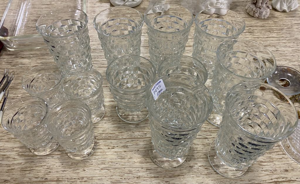Set of Midcentury Whitehall Footed Glasses. Includes 7 Tea Glasses, 2 Whiskey Glasses, 4 Juice Glasses. One of the tea glasses has chip on edge. Location Front Shelves Top Row Set of Midcentury Whitehall Footed Glasses. Includes 7 Tea Glasses, 2 Whiskey Glasses, 4 Juice Glasses. One of the tea glasses has chip on edge. Location Front Shelves Top Row