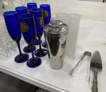 Grouping of Champagne, Flower Bud Vases, Drink Shaker, and Sterling Handled Cake Knife and Metal Tongs. Cake knife is damaged. 6 Blue Splendors of Versailles Champagne Glasses, 4 Frosted Glass Flower Bud Vases Grouping of Champagne, Flower Bud Vases, Drink Shaker, and Sterling Handled Cake Knife and Metal Tongs. Cake knife is damaged. 6 Blue Splendors of Versailles Champagne Glasses, 4 Frosted Glass Flower Bud Vases