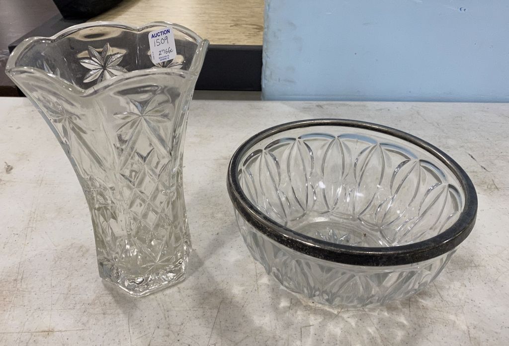 Pressed Glass Flower Vase Star Lattice Vintage Retro, Vintage Art Deco Crystal Salad Bowl Silver Lined, Location Front Shelves Top Row Pressed Glass Flower Vase Star Lattice Vintage Retro, Vintage Art Deco Crystal Salad Bowl Silver Lined, Location Front Shelves Top Row