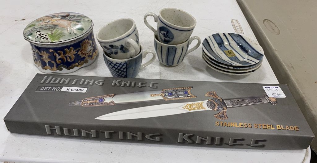 Hunting Knife Art No: K-074SV, 4 Piece Tea and Saucer Kafuh Japan Set, Hand Painted Covered Powder or Dresser Oval Box or Capodimonte, Location Front Shelves 2nd Shelf Hunting Knife Art No: K-074SV, 4 Piece Tea and Saucer Kafuh Japan Set, Hand Painted Covered Powder or Dresser Oval Box or Capodimonte, Location Front Shelves 2nd Shelf