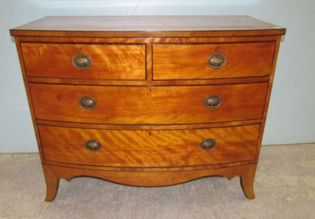 Brass pulls, five drawers, inlaid wood border trim, few small veneer spots missing, top has some small bubbles and wear, finish is good condition, dove tailed drawers, antique, 33"h., 41"w., 20"d. Brass pulls, five drawers, inlaid wood border trim, few small veneer spots missing, top has some small bubbles and wear, finish is good condition, dove tailed drawers, antique, 33"h., 41"w., 20"d.