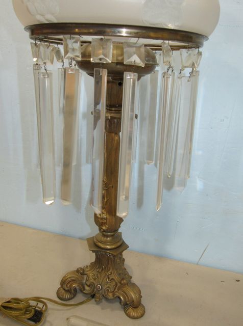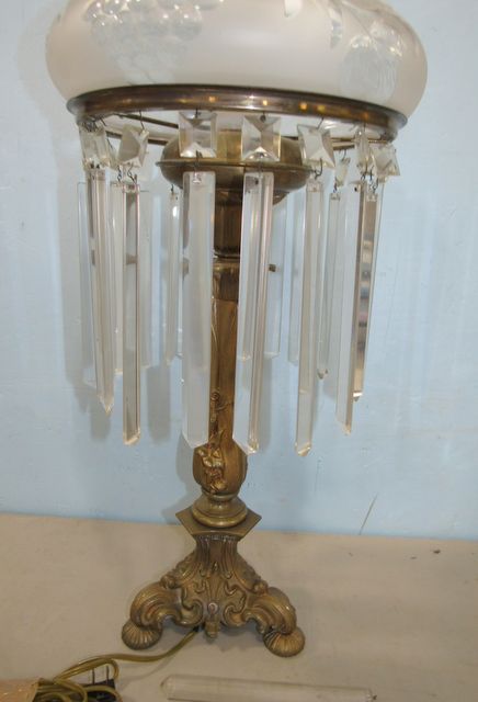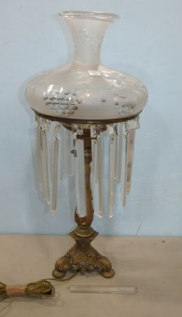 Large waterfall prism, one needs wire hanger, etched glass shade, 29"h. Large waterfall prism, one needs wire hanger, etched glass shade, 29"h.