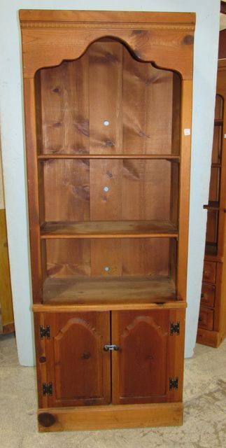 Four shelves, pine, two door storage, 80"h., 30"w., 17"d. Four shelves, pine, two door storage, 80"h., 30"w., 17"d.