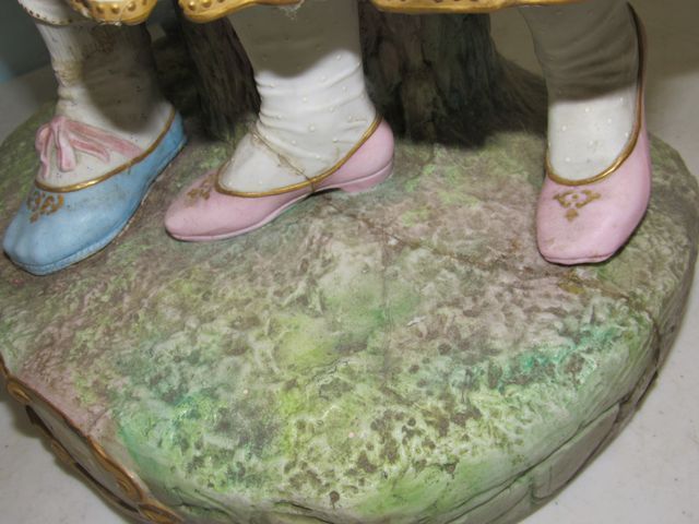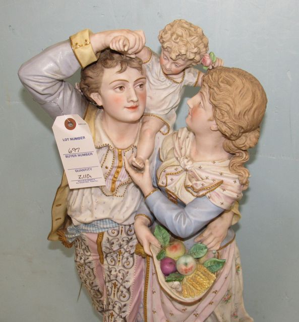Men, Lady, and Child, hand painted, base has repaired crack, 26"h. Men, Lady, and Child, hand painted, base has repaired crack, 26"h.