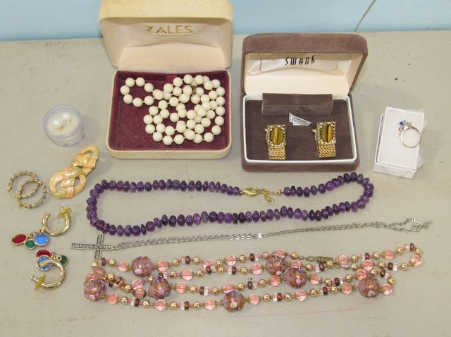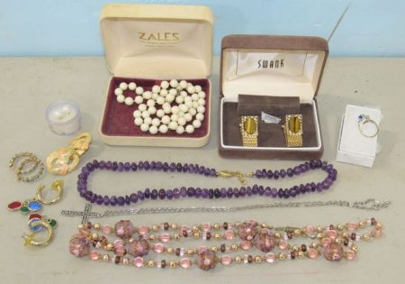 Three necklaces, beaded necklaces, metal chain with cross pendant, gold tone cufflinks, faux pearl earrings and necklace, three pair on costume earrings, 10 k blue stone ring. Three necklaces, beaded necklaces, metal chain with cross pendant, gold tone cufflinks, faux pearl earrings and necklace, three pair on costume earrings, 10 k blue stone ring.