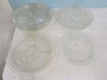 Five Ridged clear glass divided serving plates 14"dia., Three press glass under plates. Five Ridged clear glass divided serving plates 14"dia., Three press glass under plates.