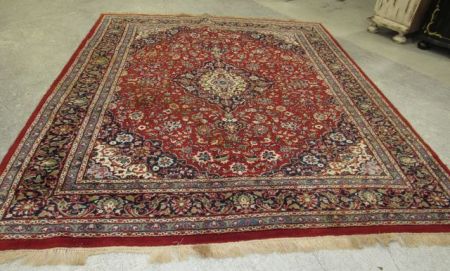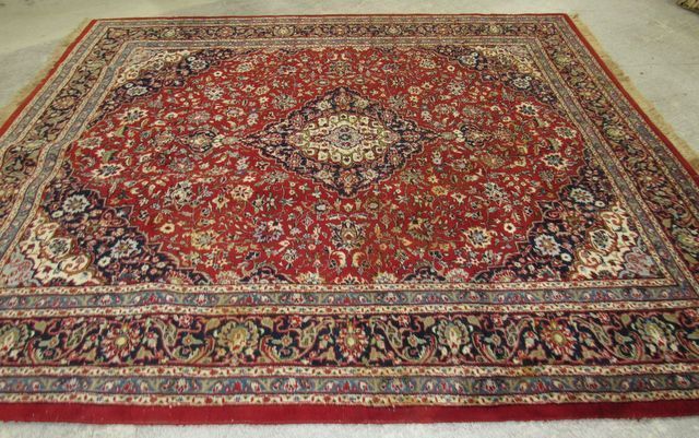 Hand knotted, 100% wool, red and blue, needs cleaning, few stain spots. 8'3 x 9'10 Hand knotted, 100% wool, red and blue, needs cleaning, few stain spots. 8'3 x 9'10