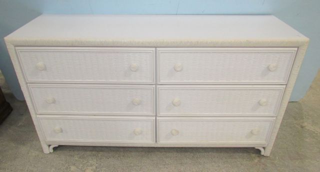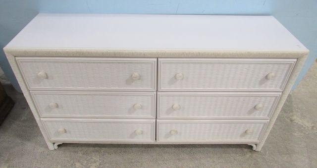 Double dresser six drawers, white laminate sides and top, faux wicker front, 30"h., 57"w., 18"d. Double dresser six drawers, white laminate sides and top, faux wicker front, 30"h., 57"w., 18"d.
