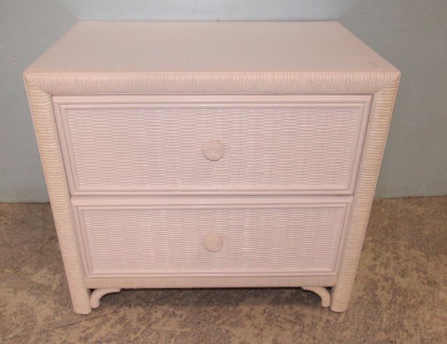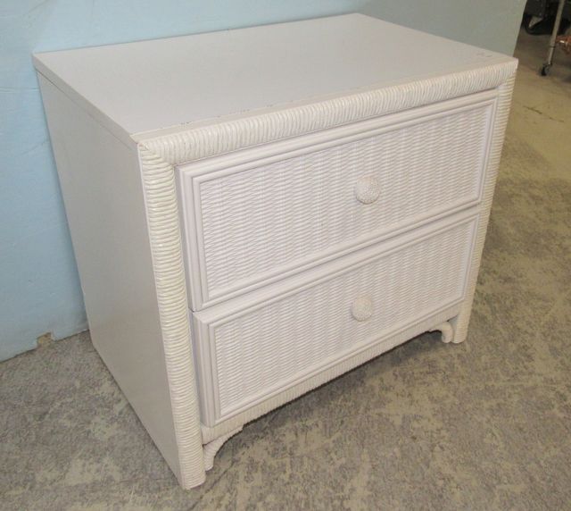 Two drawer end table, white laminate sides and top, faux wicker front, 22"h., 25"w., 16"d. Two drawer end table, white laminate sides and top, faux wicker front, 22"h., 25"w., 16"d.