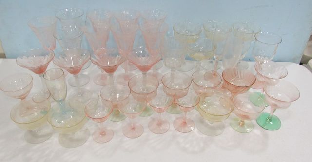 Ten etched glass wine stems, four etched glass martini glasses, eight sherbets glasses, four wine flutes, and etc. 41 total pieces. Ten etched glass wine stems, four etched glass martini glasses, eight sherbets glasses, four wine flutes, and etc. 41 total pieces.