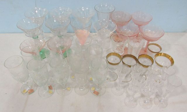 Ten etched glass wine stems, Nine etched glass handled Avitra flutes, five gold rim goblets, and etc. 39 total. Ten etched glass wine stems, Nine etched glass handled Avitra flutes, five gold rim goblets, and etc. 39 total.