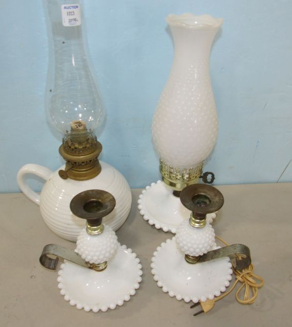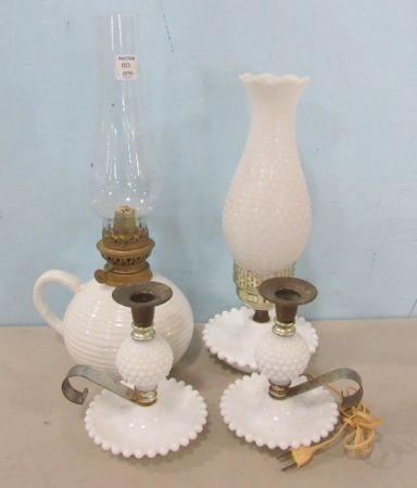 Hobnail electric lantern and candleholders, Vintage milk glass oil lamp. Hobnail electric lantern and candleholders, Vintage milk glass oil lamp.