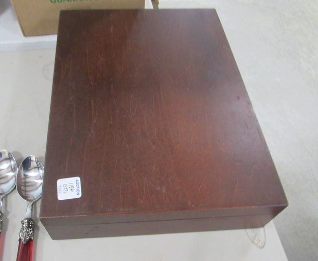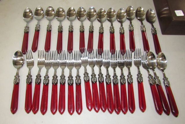 Red plastic handles, stainless, 32 total pieces, includes a flatware box. Red plastic handles, stainless, 32 total pieces, includes a flatware box.