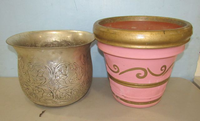 Metal etched planter 11"h., 14"dia., Painted pink pottery planter 14"h., 16"dia. Metal etched planter 11"h., 14"dia., Painted pink pottery planter 14"h., 16"dia.
