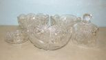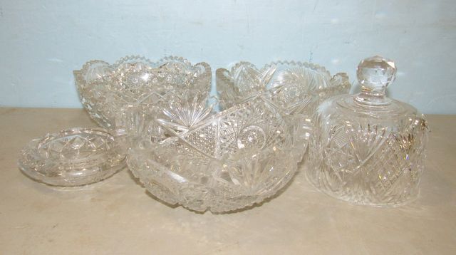 1218 Three Pressed and Cut Glass Bowls, Cake Cover, and Ashtray