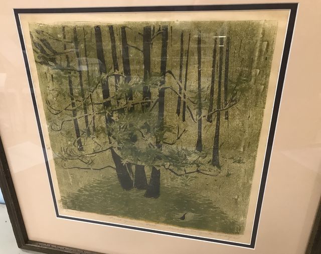 Framed Lino cut "Gum in Fall" by Mildred Wolfe, signed in pencil, matted, frame is 21"h., 21"w. Framed Lino cut "Gum in Fall" by Mildred Wolfe, signed in pencil, matted, frame is 21"h., 21"w.