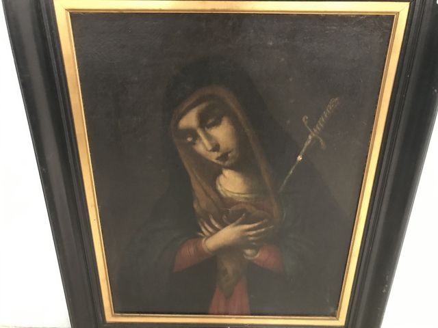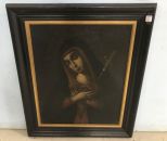 Luis De Morales Style Painting of Mary Reproduction, oil on canvas, needs research for age, does have small puncture on sword blade, 31"h., 26"w. Luis De Morales Style Painting of Mary Reproduction, oil on canvas, needs research for age, does have small puncture on sword blade, 31"h., 26"w.