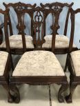 Seven Chippendale Reproduction Dinning Chairs, ball-n-claw, solid mahogany, serpentine top rails, some have normal finish wear, nice fabric cushion, good condition, 40"h. Seven Chippendale Reproduction Dinning Chairs, ball-n-claw, solid mahogany, serpentine top rails, some have normal finish wear, nice fabric cushion, good condition, 40"h.