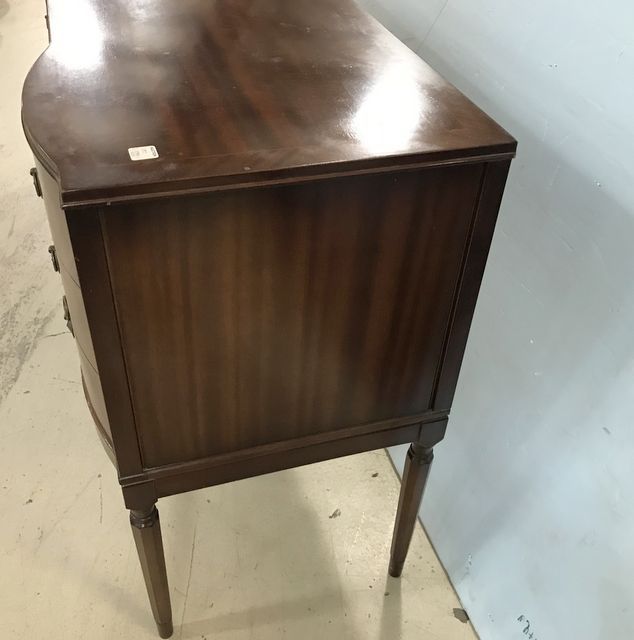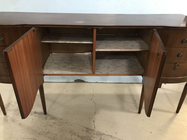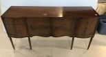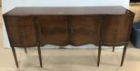 Strong Box Furniture Sheraton Style Buffet, flame mahogany, inlaid trim, double door storage, 6 side drawers, has minor swirls and white spot on top, 34"h., 66"w., 17"d. Strong Box Furniture Sheraton Style Buffet, flame mahogany, inlaid trim, double door storage, 6 side drawers, has minor swirls and white spot on top, 34"h., 66"w., 17"d.