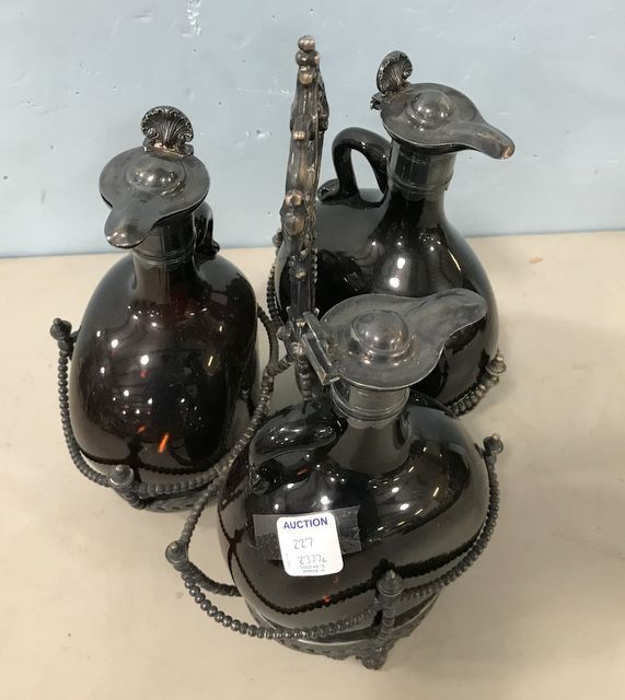 Vintage English Silver Plate Liquor Set, ornate silver plate stand with red glass decanters, silver plate spouts, 12"h. Vintage English Silver Plate Liquor Set, ornate silver plate stand with red glass decanters, silver plate spouts, 12"h.