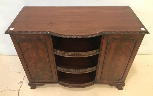 Vintage Mahogany Open Front Commode, made in Charak Furniture Company, Bafton, Mal, three center display shelves with carved gallery, two doors, with single shelves, no key, 32"h., 42"w., 17"d. Vintage Mahogany Open Front Commode, made in Charak Furniture Company, Bafton, Mal, three center display shelves with carved gallery, two doors, with single shelves, no key, 32"h., 42"w., 17"d.