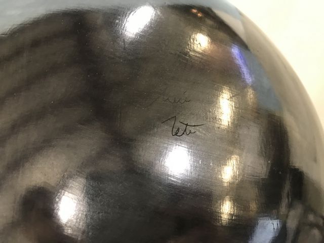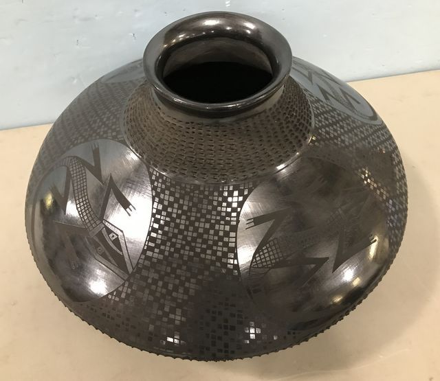 World famous Mata Ortiz pot, hand made by pinching and coil method, geometric designs, hand painted, Olla pot, Lizard image, made for artwork/decor, popular in Santa Fe, NM. Black finish, signed Luciero Toto, retail is 700.00, 9"h., 14"dia. World famous Mata Ortiz pot, hand made by pinching and coil method, geometric designs, hand painted, Olla pot, Lizard image, made for artwork/decor, popular in Santa Fe, NM. Black finish, signed Luciero Toto, retail is 700.00, 9"h., 14"dia.